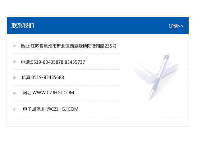 地址:常州市新北區友邦商務大廈1幢16、17層  電話:0519-85101652  傳真:0519-85112595  郵編:213022  網址:www_cz-jiayue_cn.nmscl.com  郵箱:xiajifengaa@163.com